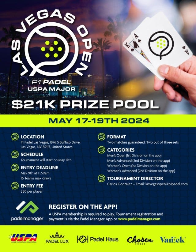 The P1 Las Vegas Open will be accepting entries through May 9 via Padel Manager and tickets for the event can be purchased here.