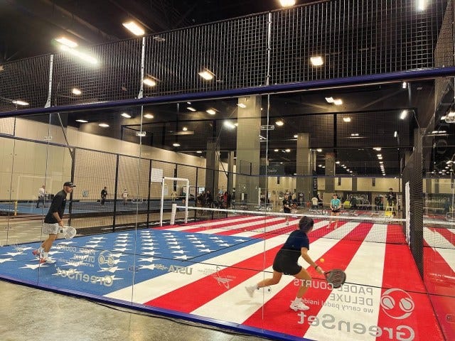RacquetX featured not just one, but four exhibition padel courts — including one decked out in the stars and stripes of the American flag — which were full morning, noon, and night. I saw everyone from giddily curious first-timers to seasoned pros taking the court and there was almost always a line of people who wanted to play next.